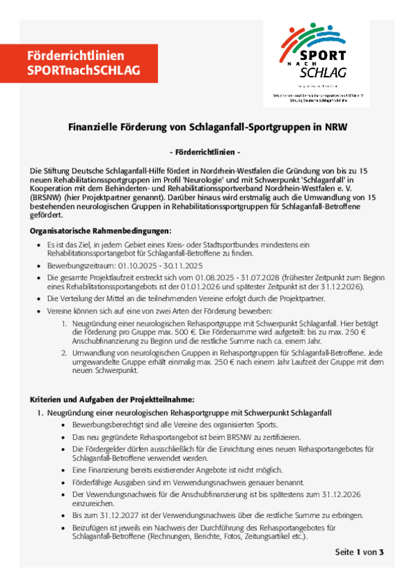 sondern diesmal wird auch die UMWANDLUNG von bestehenden Gruppen in spezielle Angebote für Schlaganfall-Betroffene gefördert.